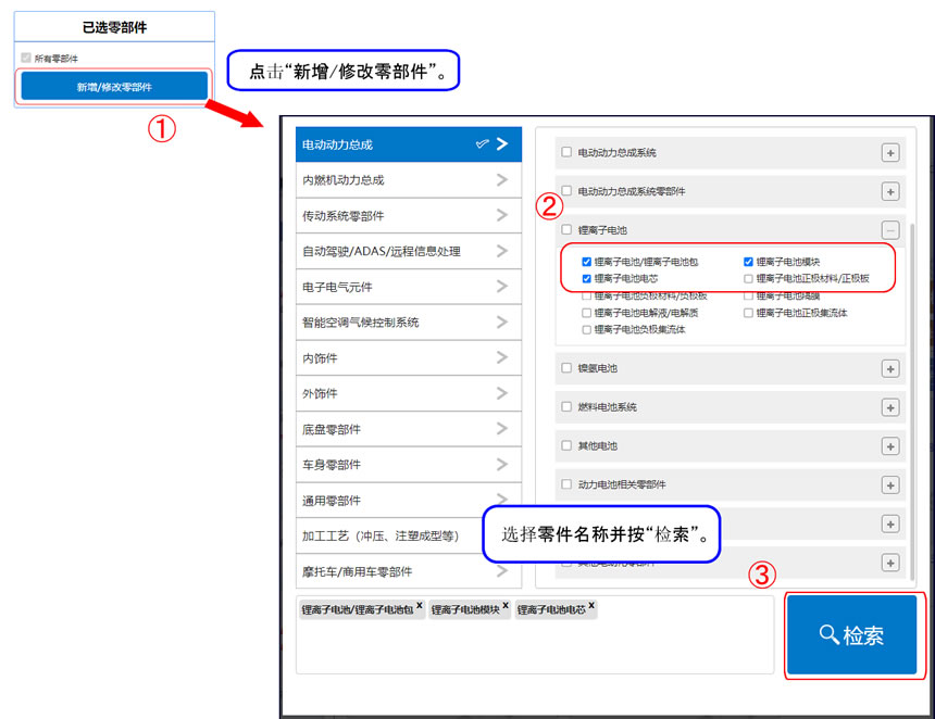 如需指定零部件进行细分检索时,请点击“新增/修改零部件”。