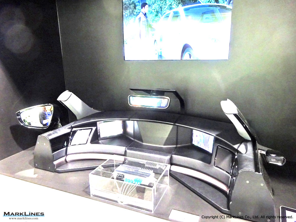 ・ドアミラー置換えカメラモニターシステムはカメラの小型化により空力性能、直接視界の改善、デザイン性の向上が可能となっている。画像解析により、車両周辺の状況を検出し、車線変更する運転手に対して注意喚起を行ったり、走行シーンに合わせて映像の画角を変化させることで運転手の運転支援を行うことも可能である。ブースではタブレットに映した車両の画像をカメラの前にかざすと注意を促すシーンをデモで紹介している。