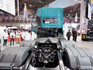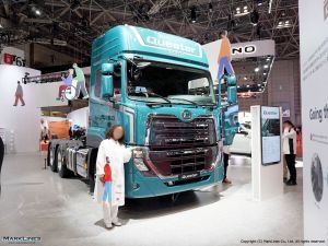 ・一方、UDトラックは、GH13エンジンで重量物運搬に適した大型トラクタの「Quon GW 6x4」や欧州連合(EU)が定める排出ガス規制「ユーロ6」に準拠した新興国専用の大型トラック「Quester」を展示した。「Quester」は最高出力343kW、最大トルク2,250Nmで、最大積載量は20トン。