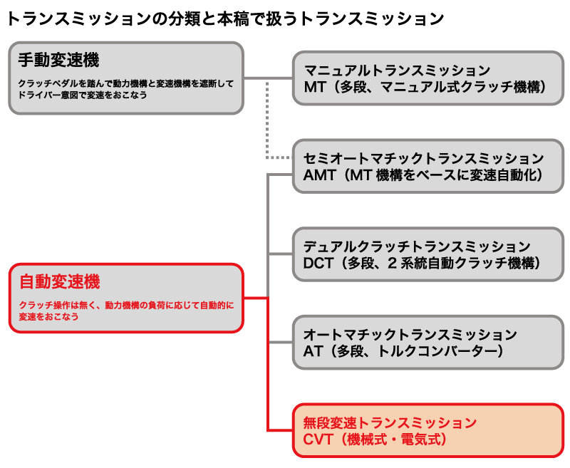 本稿で扱う範囲は、上図のオートマチックトランスミッションのうち以下の連続可変型変速機(以下、CVTと称す)である。
