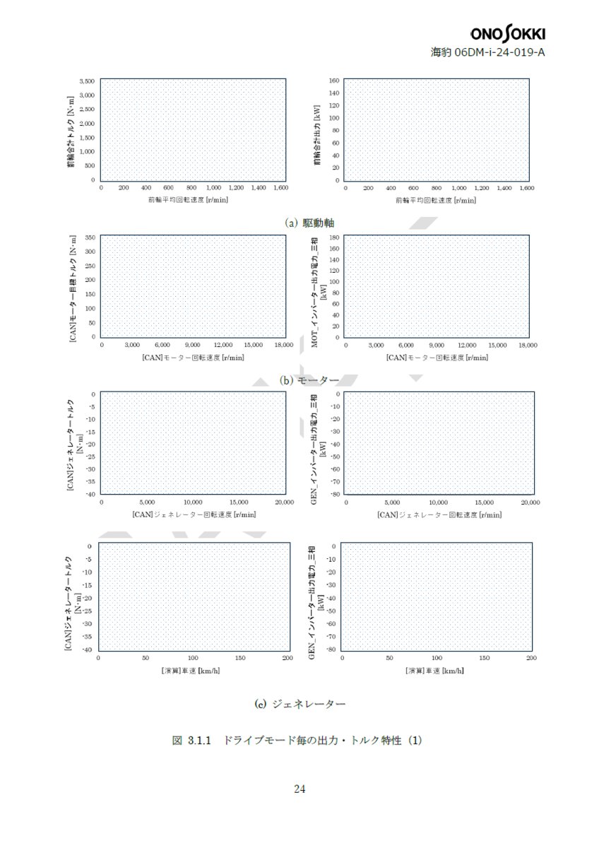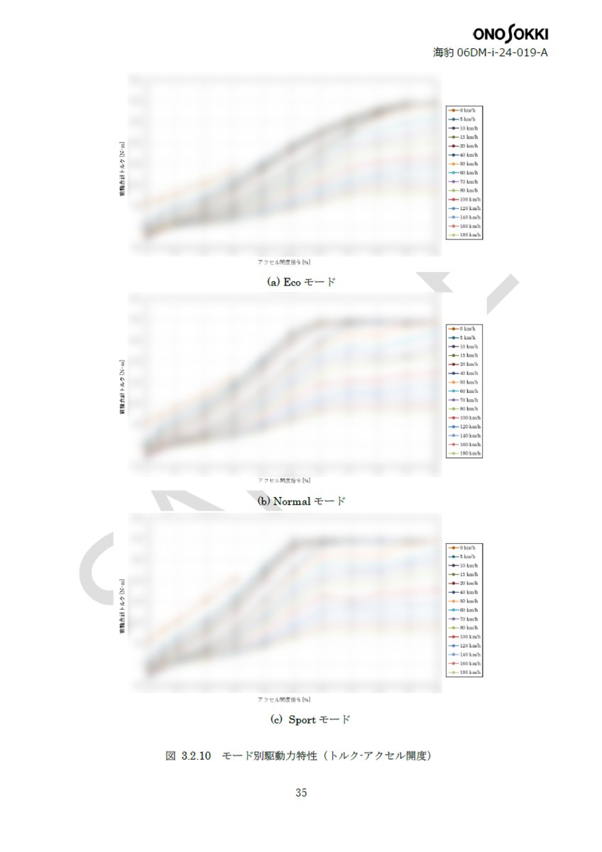 - 駆動力特性 :ドライブモード毎のアクセル開度に対する駆動軸出力の特性を測定した。