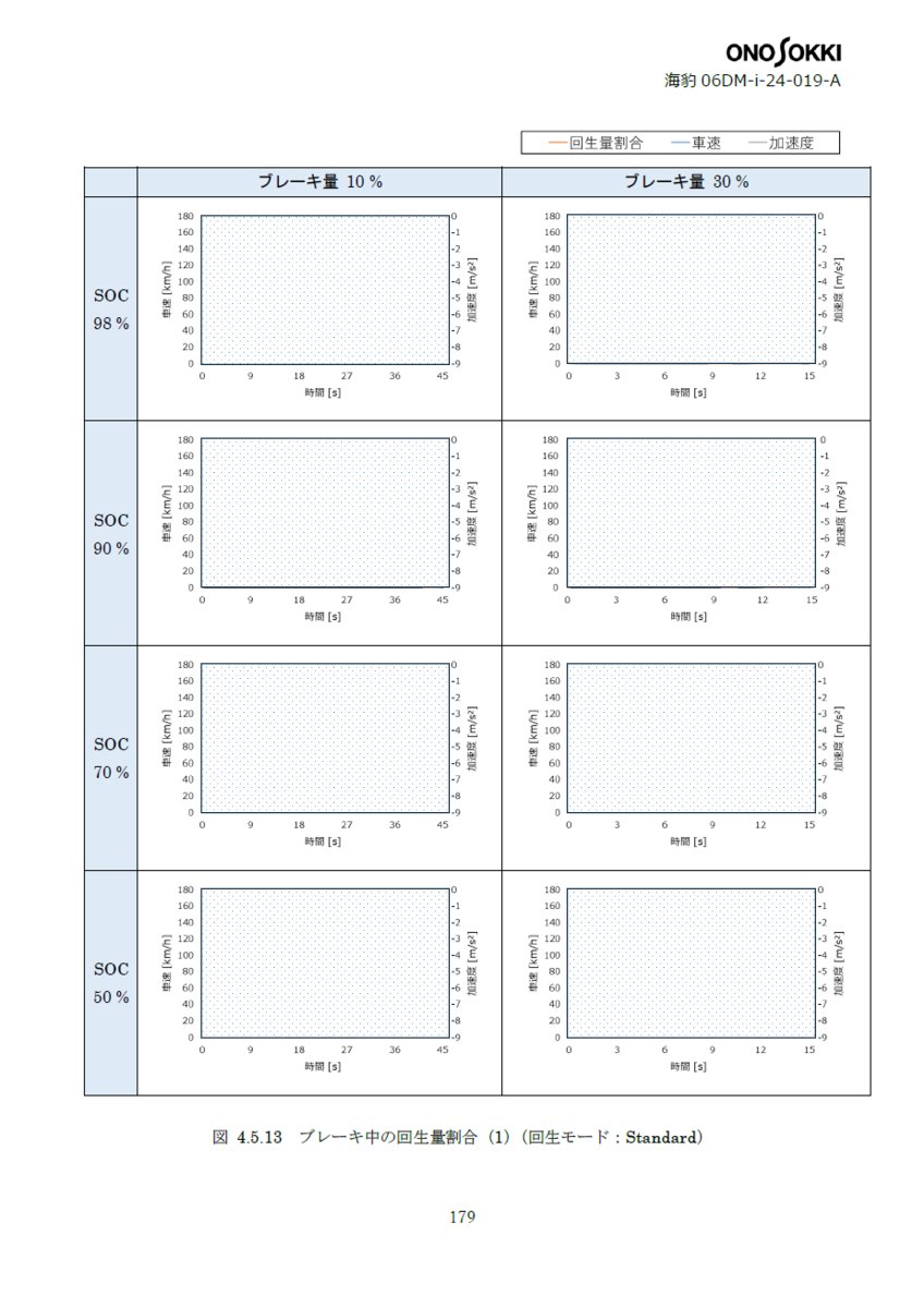 - チップアウト・回生特性 :ブレーキペダルを操作したときの回生電力量とメカニカルブレーキの挙動を調査した。