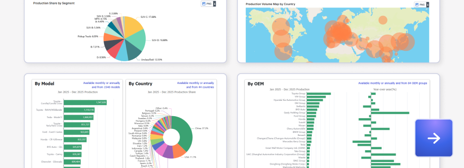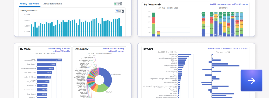 Search for information including monthly production/sales volumes by model across countries worldwide, sales volumes filtered by EV/HV, sales volumes by powertrain type, and passenger vehicle retail registrations in China.
