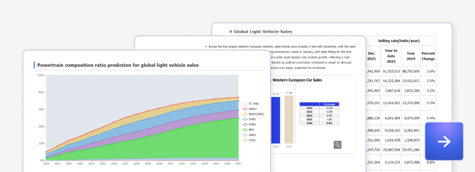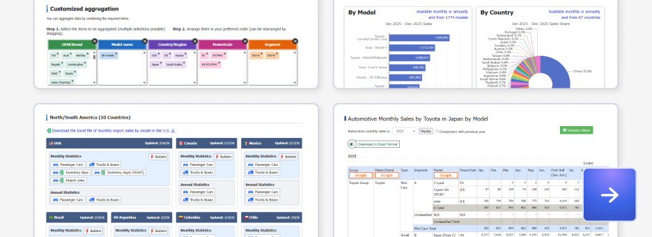 The world's only information service that comprehensively covers a wide range of global automotive industry information — such as market, technology, parts supplier and production — and provides it as an integrated package.